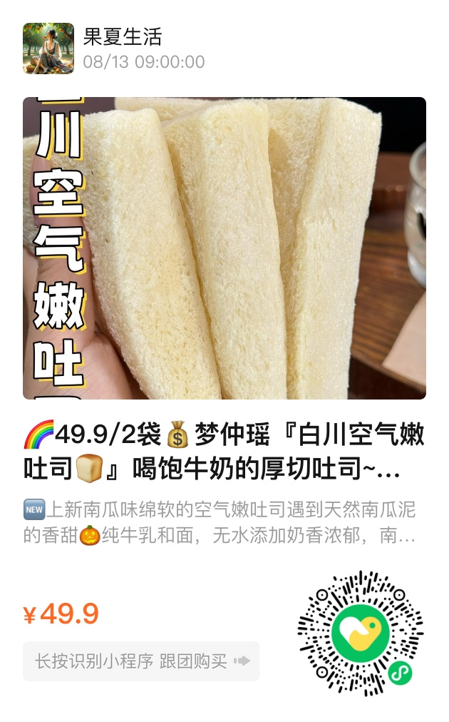 吐司的世界原本平凡,但白川的工艺偏偏多了几分执拗。三次醒发的面团,在仿手工揉面的温柔力道中苏醒,像故宫匠人打磨一件漆器,时间成了唯一的度量衡。有意思的是,有人曾对比过日本生吐司的价格——76元只能买450克,而白川的420克还不到25元。这让我想起苏轼《老饕赋》里的”尔乃止水为醪,曲米为春”,真正的好味道从来不需要镀金,就像这吐司,用南瓜泥的自然清甜代替香精,用海藻糖的微妙平衡替代齁甜,诚实得让人心疼。