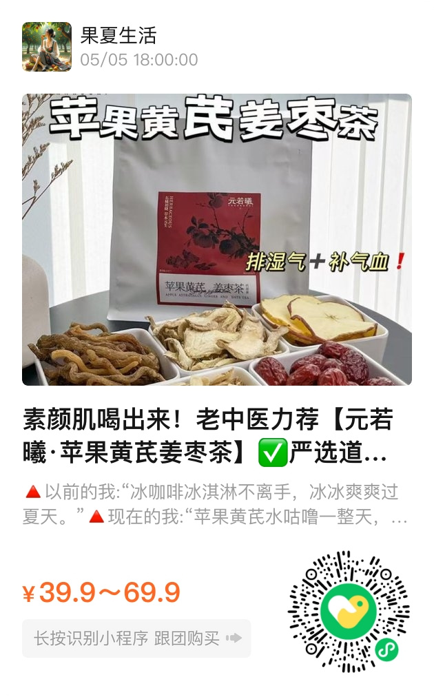 总结:元若曦·苹果黄芪姜枣茶,用黄芪的沉稳、苹果干的温润、小黄姜的热烈、红枣的甘美和玉竹的清雅,熬成一杯有风骨的东方滋养。