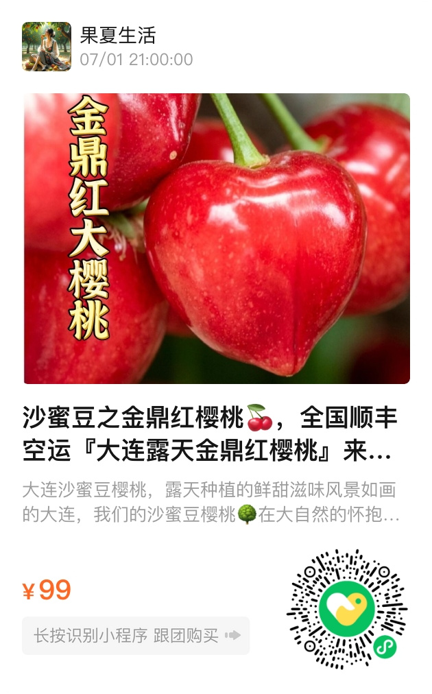 限时活动:99元秒杀3斤装,顺丰空运直达! 珍珠棉内包装呵护每一颗樱桃,确保您收到的每一颗都鲜嫩如水。这个夏天,让金鼎红樱桃用自然的风味,为您的生活添一抹亮色吧!