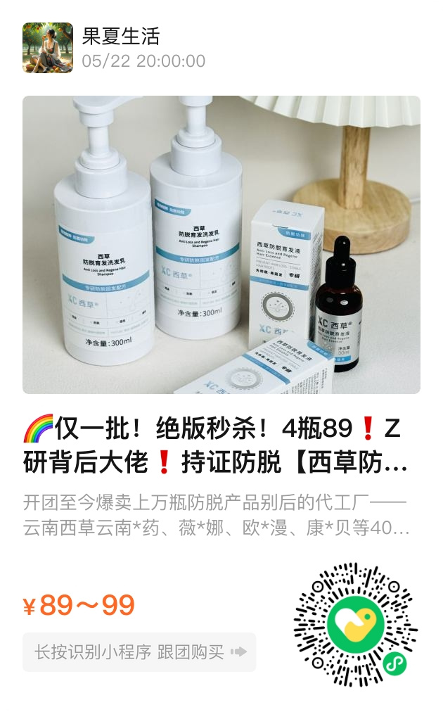 总结:从《本草纲目》的侧柏叶到现代实验室的透皮专利,西草用22年植萃研发打磨出持证防脱方案。洗护套装如刨地播种,先净头皮后养毛囊,让每根头发都似滇西的松柏,风雨愈狂,扎根愈深。