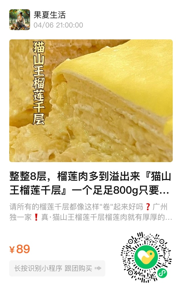 即日起至夏末,这款曾让广州食客排队三小时的猫山王榴莲千层,正以89元的诚意价奔赴你的餐桌。6英寸圆润如满月,适合与三两好友分享,或独自窝在沙发里用舌尖丈量甜蜜的厚度。顺丰冷链载着液氮锁鲜的果香,将马来西亚阳光的温度准确递送——毕竟,真正的美味从不该有时差。