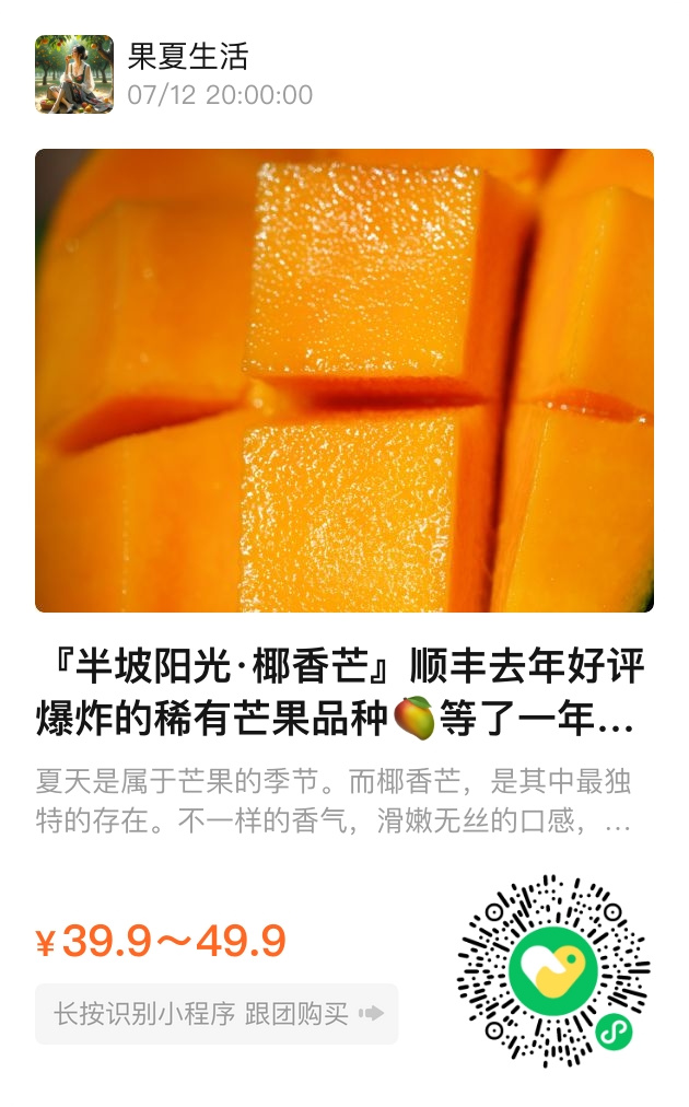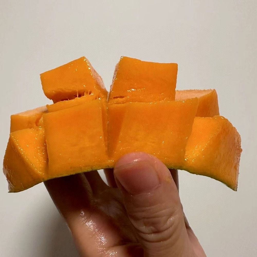沈从文笔下湘西的果子总带着山野灵气,这椰香芒又何尝不是?青衣下的金黄果肉像溶化的蜜蜡,纤维细得尝不出,倒让人想起《红楼梦》里宝钗吃的胭脂鹅脯——”不用刀切,只拿银簪子挑着吃”。成熟时轻轻一按,软糯的触感让人想起江南的糯米糍,只是这来自西南山峦的尤物,连余味都染着热带的海风气息。