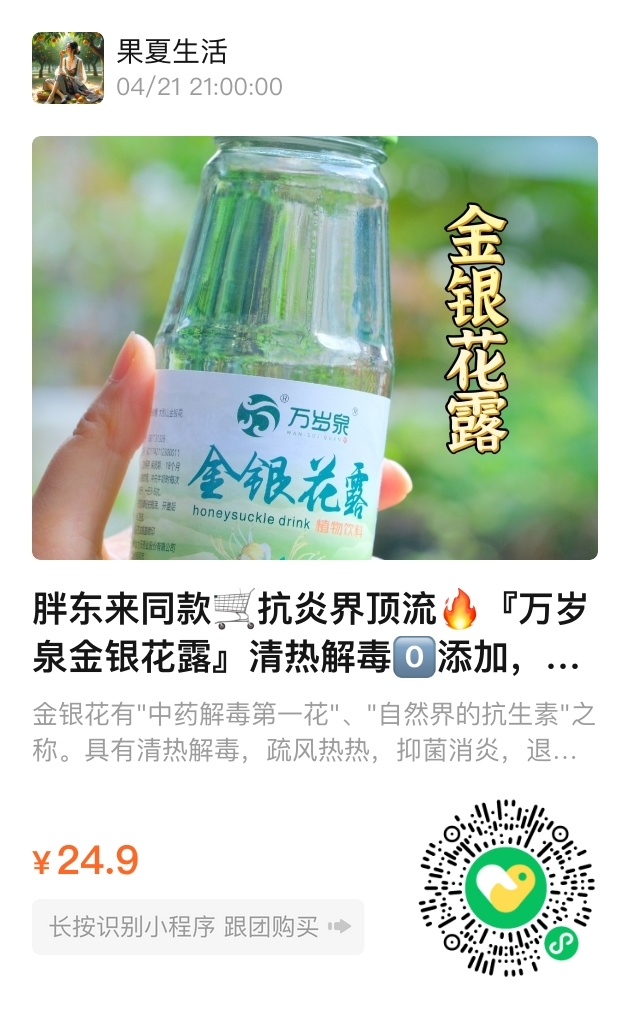 胖东来货架上总被扫空的秘密,藏在瓶底沉淀的几丝花蕊里。六瓶二十四块九的价格,算下来比超市单买省出两顿早餐钱。山泉浇灌的金银花正当时节,蒸馏车间的老师傅说这批露水特别清甜,冰箱里冰镇过的口感,会让人想起小时候外婆用井水镇过的凉茶。这个夏天,让来自北纬30°的花露替你挡一挡暑气——六瓶刚好装满冷藏室的门格,就像备着六贴随时可用的”清凉散”。