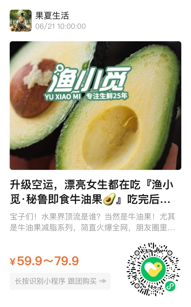 总结:从枝头到舌尖,「渔小觅·秘鲁即食牛油果」用9成熟的耐心等待,换您一口省心的美味。无需等待,即刻享受如奶酪般细腻的果肉,和萦绕唇齿的独特香气。愿这颗牛油果,成为您健康生活中轻盈又满足的陪伴。