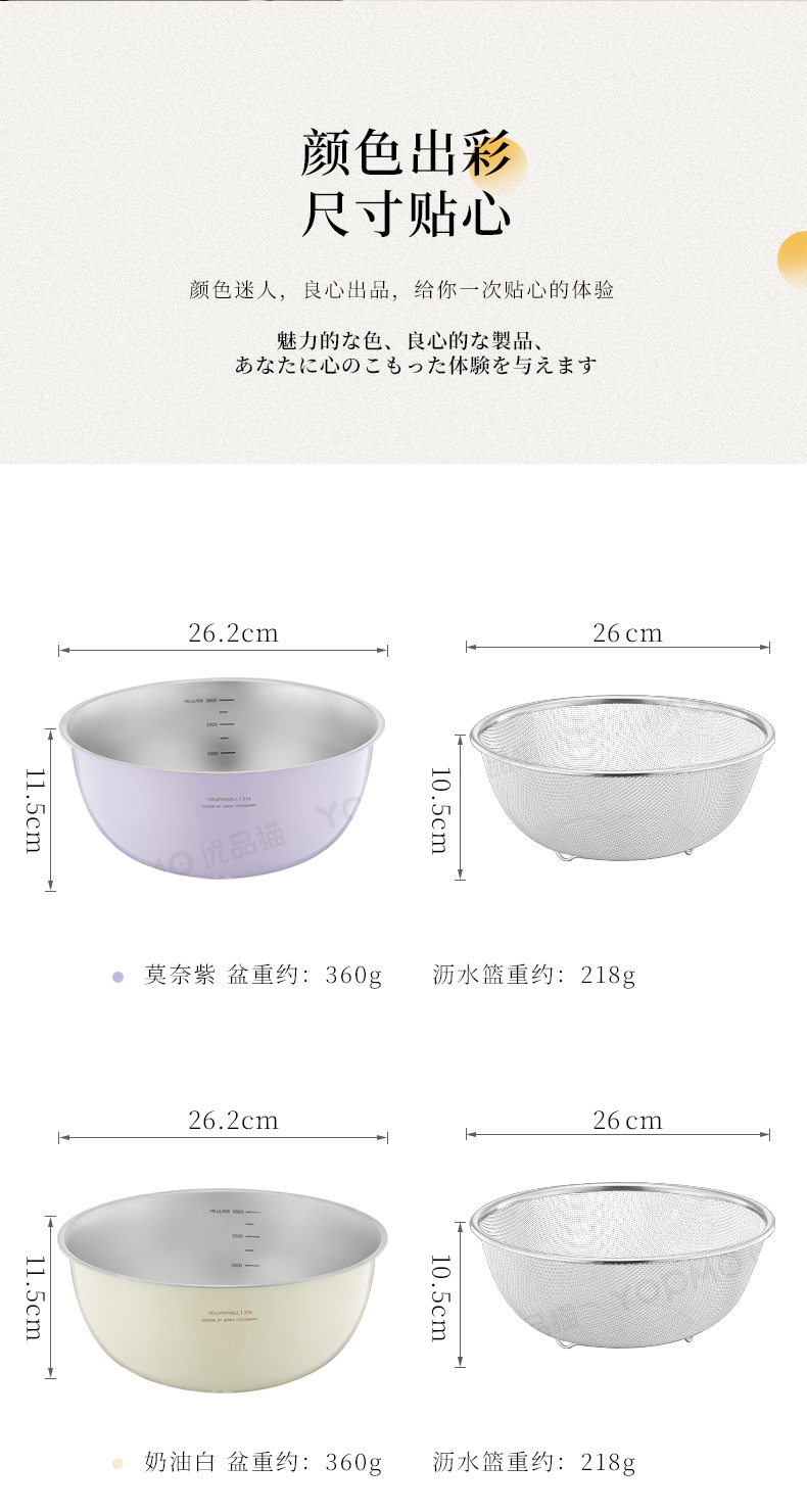 厨房的颜值也能影响做饭的心情。莫奈紫与奶油白双色可选,简约设计为厨房增添一抹高级感。滤网孔眼细密均匀,洗米不漏渣;盆身坚固抗变形,收纳省空间。无论是拌沙拉、炸食物,还是日常清洗食材,这套工具都能轻松应对。用品质说话,让每一分钱都花得值当。