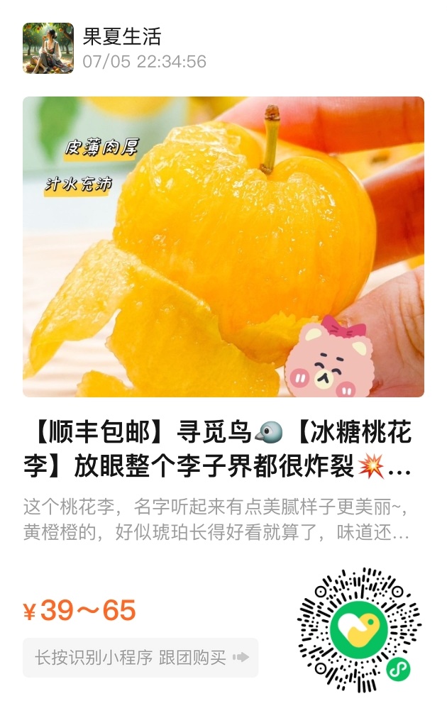 总有人问为何现在的水果少了从前的香?或许因我们太久没遇见一棵肯等待的树。这桃花李偏要等到果肉软糯如绸才肯离枝,快递箱里还藏着一缕山风的气息。掰开果实,莹润的汁液沿着纹路流淌,倒让我想起《红楼梦》里袭人剥给宝玉吃的果子——“鲜亮亮的,连核都想咽下去”。有些滋味,本就该慢慢消磨,像读一首关于夏天的叙事诗。