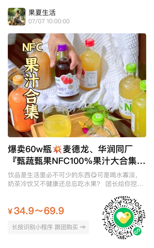 总结: 『甄蔬甄果NFC100%果汁』用十年品牌沉淀和麦德龙、华润同厂的品质保障,还原了水果最本真的味道。没有复杂工艺,只有新鲜榨取的诚意,无论是自己饮用还是分享给家人,都是健康又安心的选择。抓住这波团购,让天然果香为生活添一份简单纯粹的幸福感吧!