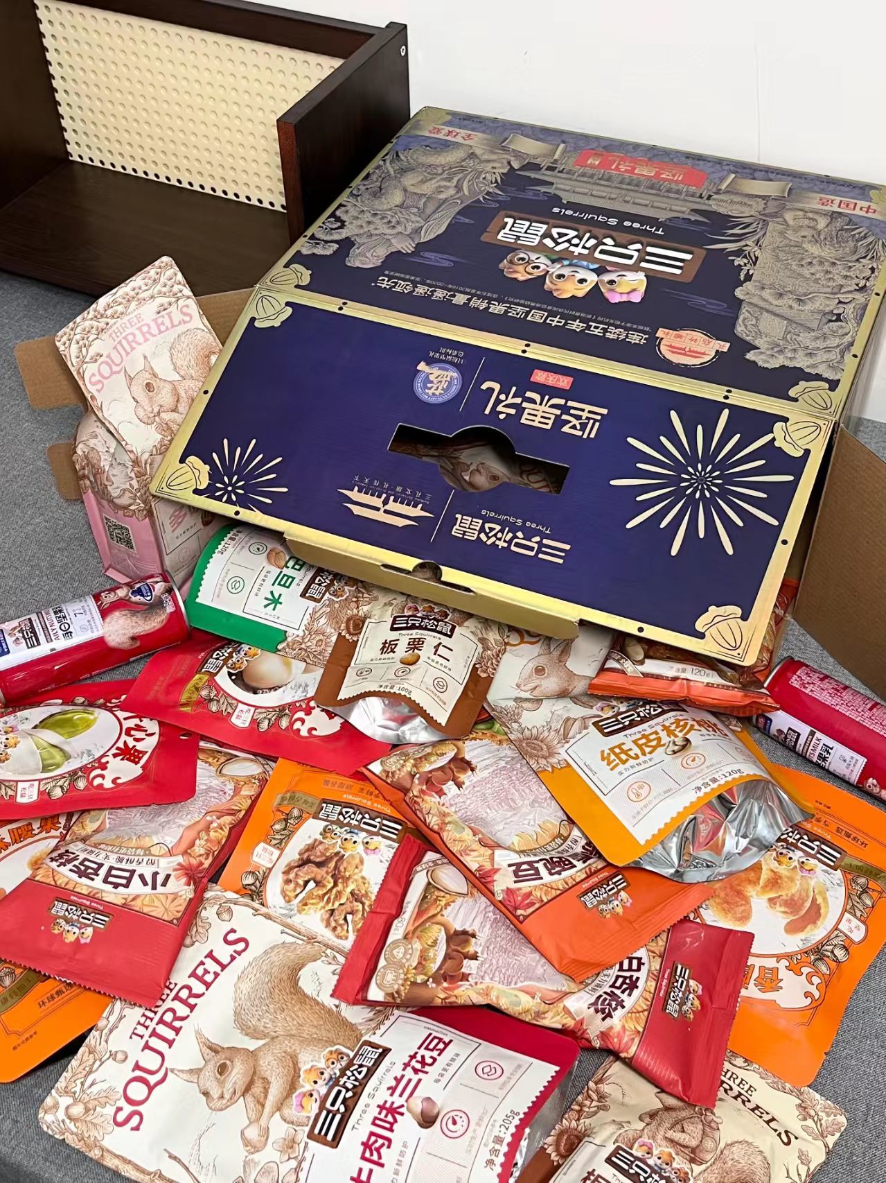 龙年礼盒上插画里的小松鼠正抱着金元宝冲你眨眼,而撕开每日坚果分装袋的干湿分离层,倒像是拆开一封来自春天的信:核桃仁的微涩配蔓越莓的酸甜,恰似人生况味。孔庙联名款的橙红礼盒摆上桌,连挑剔的二叔公也会捏着胡须点头——这年头,能把敦煌藻井纹样和坚果定价169元四盒的实惠结合得恰到好处的,怕是只有这群懂年轻人的小松鼠。想起故宫前院长单霁翔说的:“文化就是要让人看得见、摸得着、吃得到。”