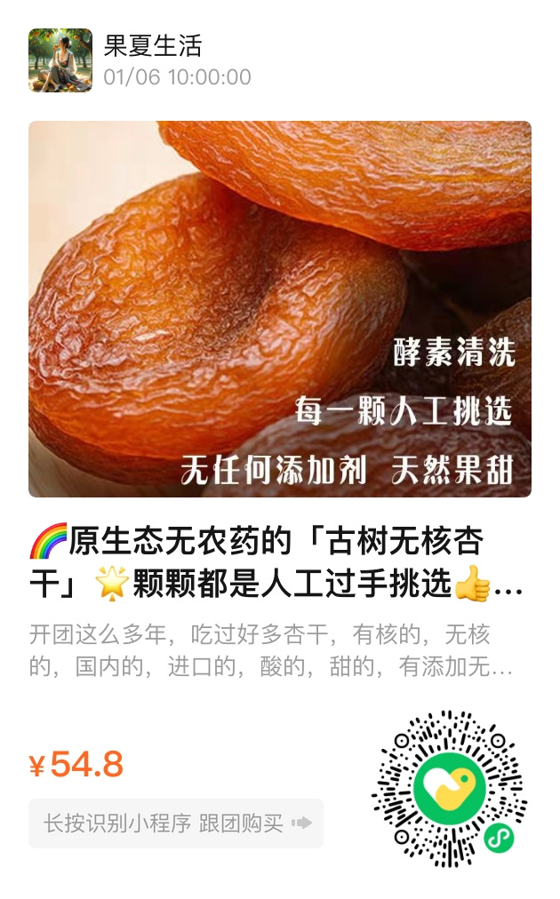 总结: 「古树无核杏干」用极致坚持还原自然本味,从产地到工艺,从品质到口感,每一环都是对健康的郑重承诺。无论是自己解馋还是分享亲友,它都能带来一份安心的甜蜜。