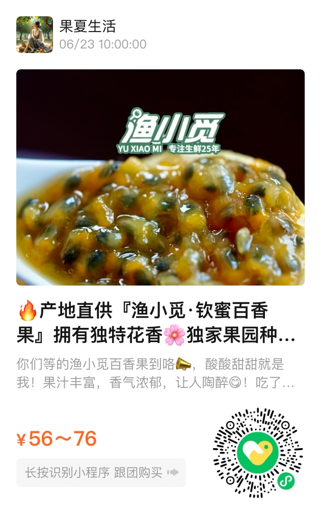 总结: 渔小觅·钦蜜百香果用科学种植还原自然本味,用甜酸密码解锁生活情趣。它不只是水果,是跨越千年的食疗智慧,是烟火日子里的诗意注解——原来幸福可以如此具体,具体到一勺爆汁的果肉,一阵掠过唇齿的夏日微风。