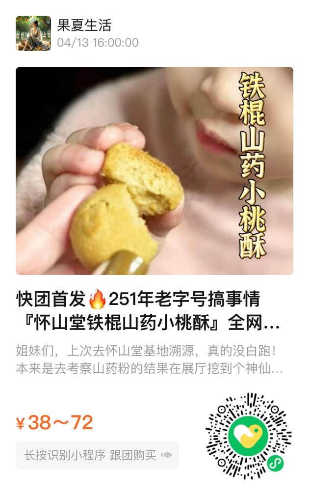 总结:怀山堂铁棍山药小桃酥以251年的匠心,将养生融入日常零嘴。无添加的纯粹、制药级的严苛,让每一口都承载着文化与健康的双重馈赠。快团团独家首发,邀你尝一口时光沉淀的温柔。