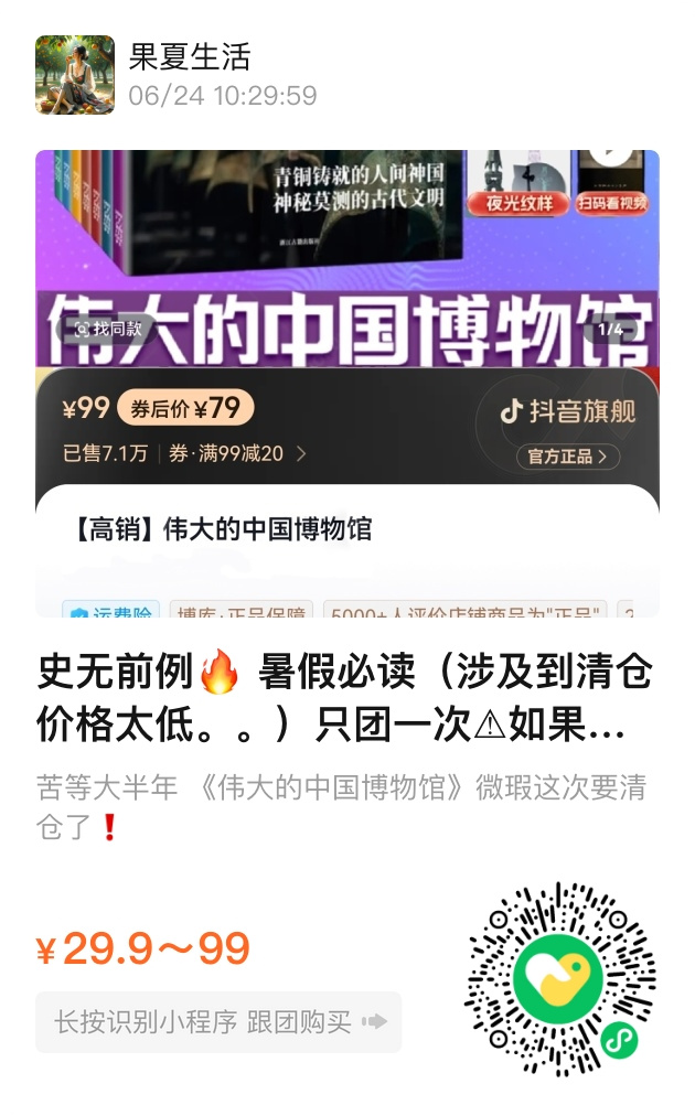 正值暑假,这套书来得恰好。在京城的家长不妨带着它去国博“寻宝”,书中的妇好鸮尊与玻璃柜里的真品隔空对望;远方的孩子也能通过视频来一场“云游”,看良渚玉琮在屏幕里折射五千年的星光。提醒一句:库存如故宫旺季门票般紧俏,毕竟29.9元换七座博物馆的通行证,连东坡先生见了都要叹一句“人生如逆旅,幸好有书缘”。