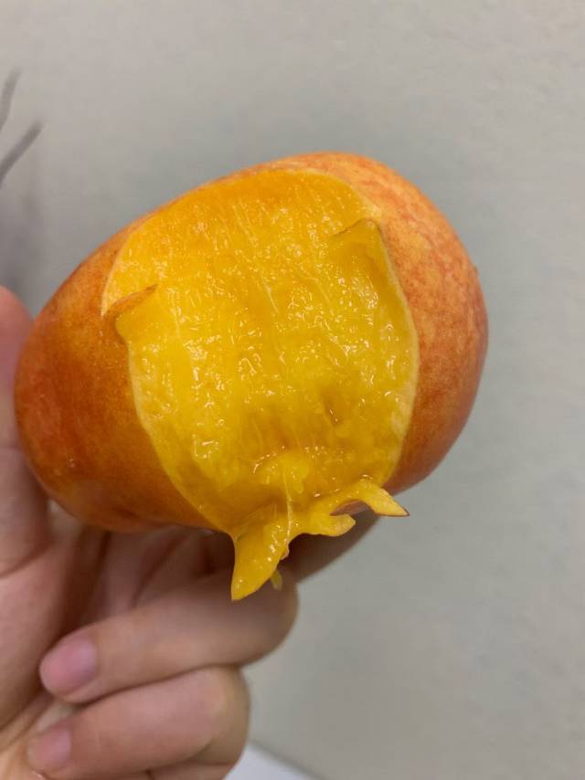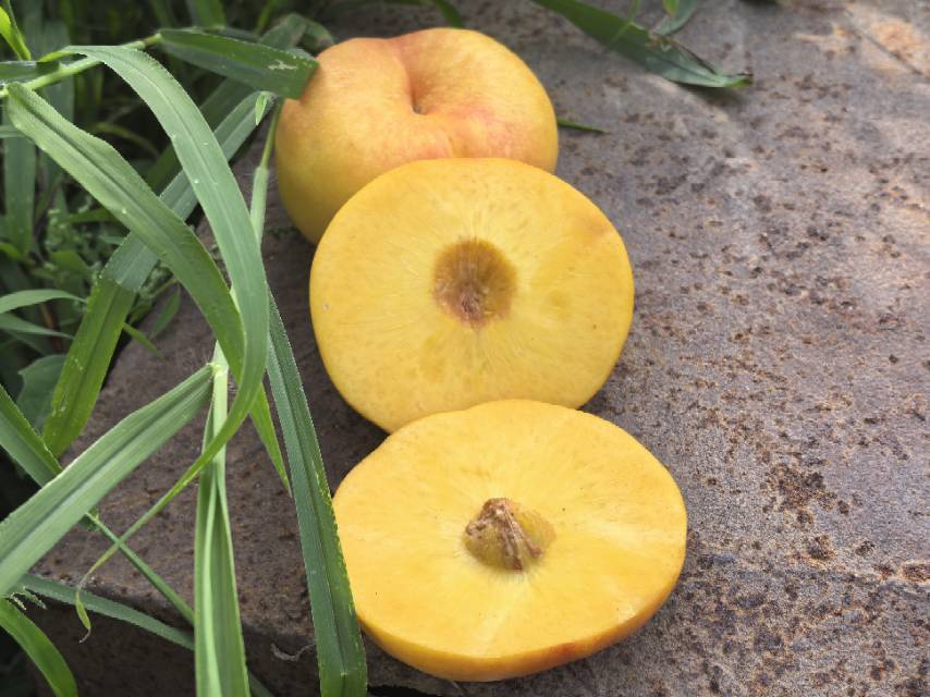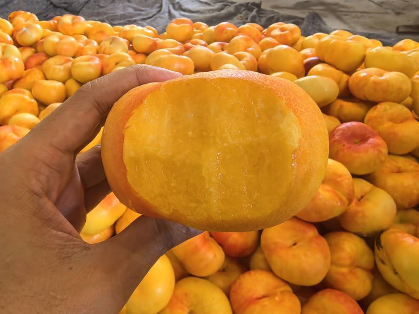 老辈人说“桃养人”,这话不假。但倘若王母娘娘的蟠桃园真在人间,我猜定是凤凰元宝油蟠桃这般模样——扁圆如金元宝,皮色澄黄透亮,无需剥皮便能入口,咬破薄如蝉翼的果皮,甜汁便顺着指尖流淌。西北的阳光将它酿出芒果般的馥郁香气,果肉却比蜂蜜更清透,硬吃脆如初雪,软吃糯似春泥,一颗桃里藏了水蜜桃的甜、油桃的爽、蟠桃的韵,连核都小得谦逊,仿佛生怕占了果肉的位置。