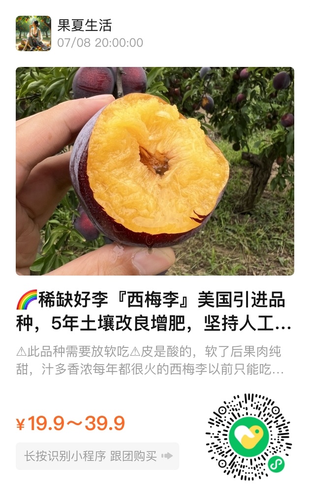 西梅李的独特风味,懂的人自然爱不释手。它既有西梅的玫瑰色外表,又有李子的饱满果肉,硬吃酸甜开胃,放软后汁水丰盈、纯甜如蜜。这种融合了两种水果优点的口感,是许多老顾客每年翘首以盼的滋味。产量稀少的特性让它更显珍贵,每一颗都凝结了果农五年土壤改良的心血,从人工除草到有机施肥,只为保留最自然的香甜。