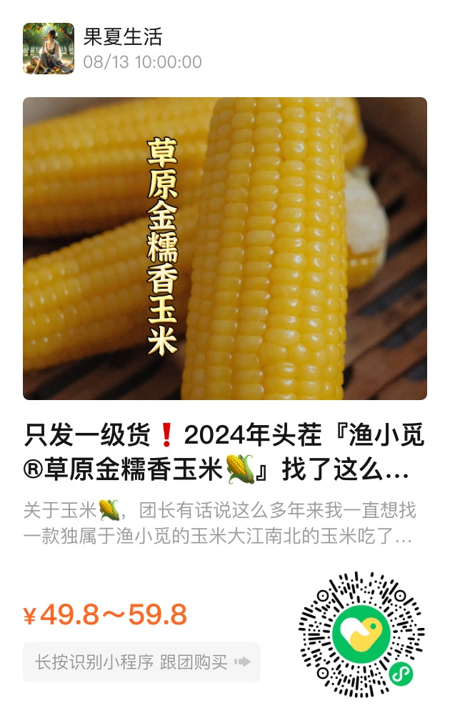 活动通知: 2024年头茬渔小觅金糯香玉米现正热销,5.5斤装限时尝鲜价!真空包装锁住新鲜,下单后72小时内发货,让这份草原风味更快抵达您的餐桌。