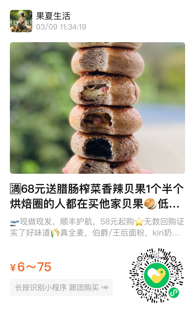 活动内容:🈵68元即送腊肠榨菜香辣贝果1个,14款口味任意混搭,贝果、欧包、碱水、肉桂卷、恰巴塔统统参与。单个贝果低至6元,买得多还送得多,现做现发,顺丰速达。