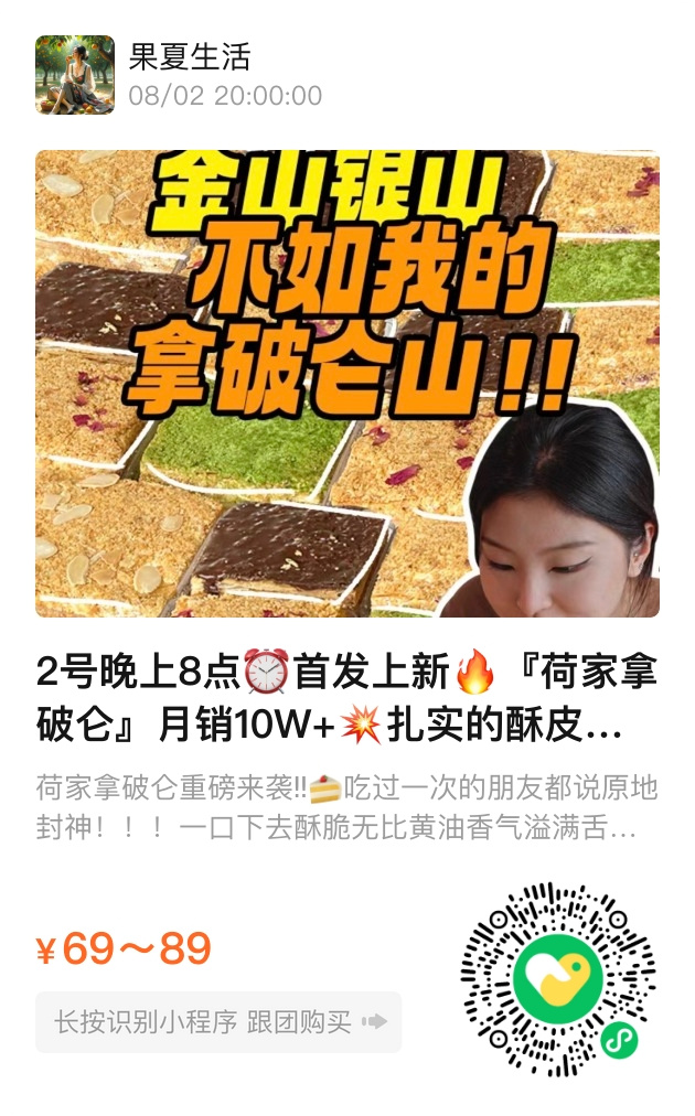 8月2日晚8点首发上新,荷家拿破仑全系多口味任选。本团价:千层酥3盒79.9元;长条蛋糕1盒69元,2盒89元;梦龙蛋糕1盒69-79元。