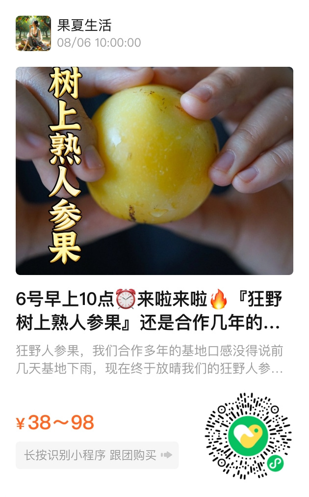 活动内容:8月6日早上10点,狂野树上熟人参果准时开抢,依旧是与老果农合作的包园种植,保证每一颗都是自然成熟、树上采摘,数量有限,错过要再等一年。