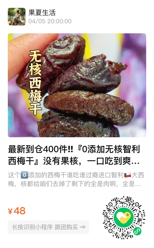 活动进行中:仁之冠0添加无核智利西梅干,开团价48元/500克装,比某宝100克39.9元的价格实在太香。现货到仓400件,售完为止。