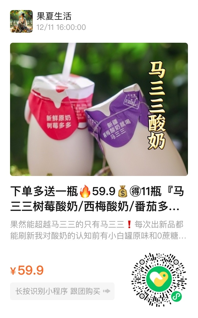 现在,马三三新口味酸奶限时开团,59.9元🉐11瓶,任意规格下单都送经典原味一罐。番茄、西梅、树莓三种新疆特色果味,搭配浓醇酸奶,让一口好味道从新疆走进你冰箱。健康、天然、安心,好喝不腻,早餐、宵夜、下午茶都刚刚好。