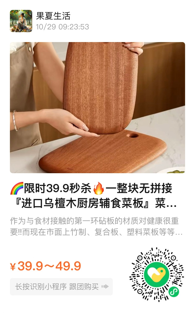 🌈活动详情:现在限时秒杀仅需39.9元起,一整块无拼接乌檀木实心砧板,原价80元,现开团立减。三款尺寸任选:圆形、水滴形、长方形,满足不同厨房所需。