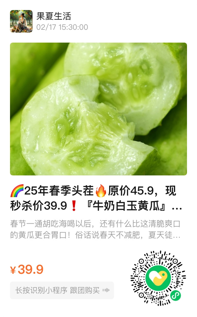 【活动信息】现购买牛奶白玉黄瓜,原价45.9元,现秒杀价39.9元。让这份春天的美味早早到来,快来尝尝这与众不同的清甜吧!