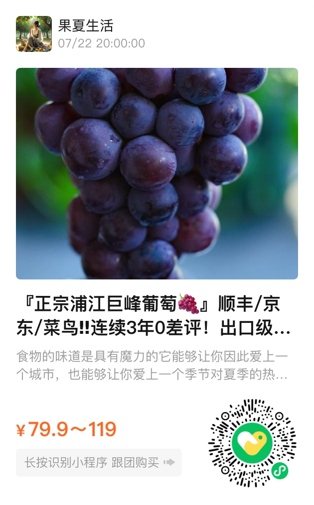 冰镇后的巨峰葡萄,是暑气里偷来的清欢。出口级的果园把它送往新加坡、俄罗斯,而此刻它就在你手边,带着浦江山水的灵气。若你细看,果霜像一层朦胧的江南烟雨,剥开时,连指尖都沾了玫瑰香。这滋味让人想起木心的话:“甜酸苦辣咸,百味之中,最是清欢惹人回味。”