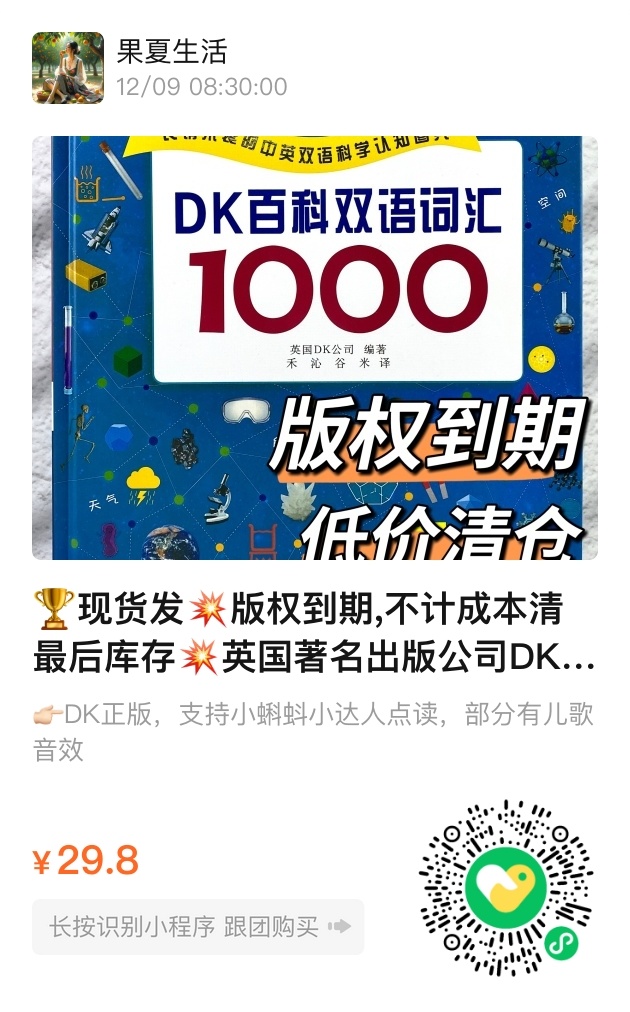翻开DK出版社这两本小书时,忽然想起古希腊人用陶片教孩童认字的场景——知识从来不是冰冷的符号,而是生活的温度与文明的微光。《DK百科双语词汇1000》像一位博学的园丁,把“月球岩石”和“太空服纽扣”这样的词种进孩子心里,STEM的种子便随着29个主题生根发芽。而《DK儿童双语词汇1000》更似邻家妈妈,从“早餐麦片”数到“雨后蜗牛”,用23个生活场景织成一张温暖的单词网。某东标价60元的书,此刻以半价泊在掌心,倒让人想起《查令十字街84号》里海莲·汉芙淘旧书的欣喜——好物遇知音,本就是人间乐事。