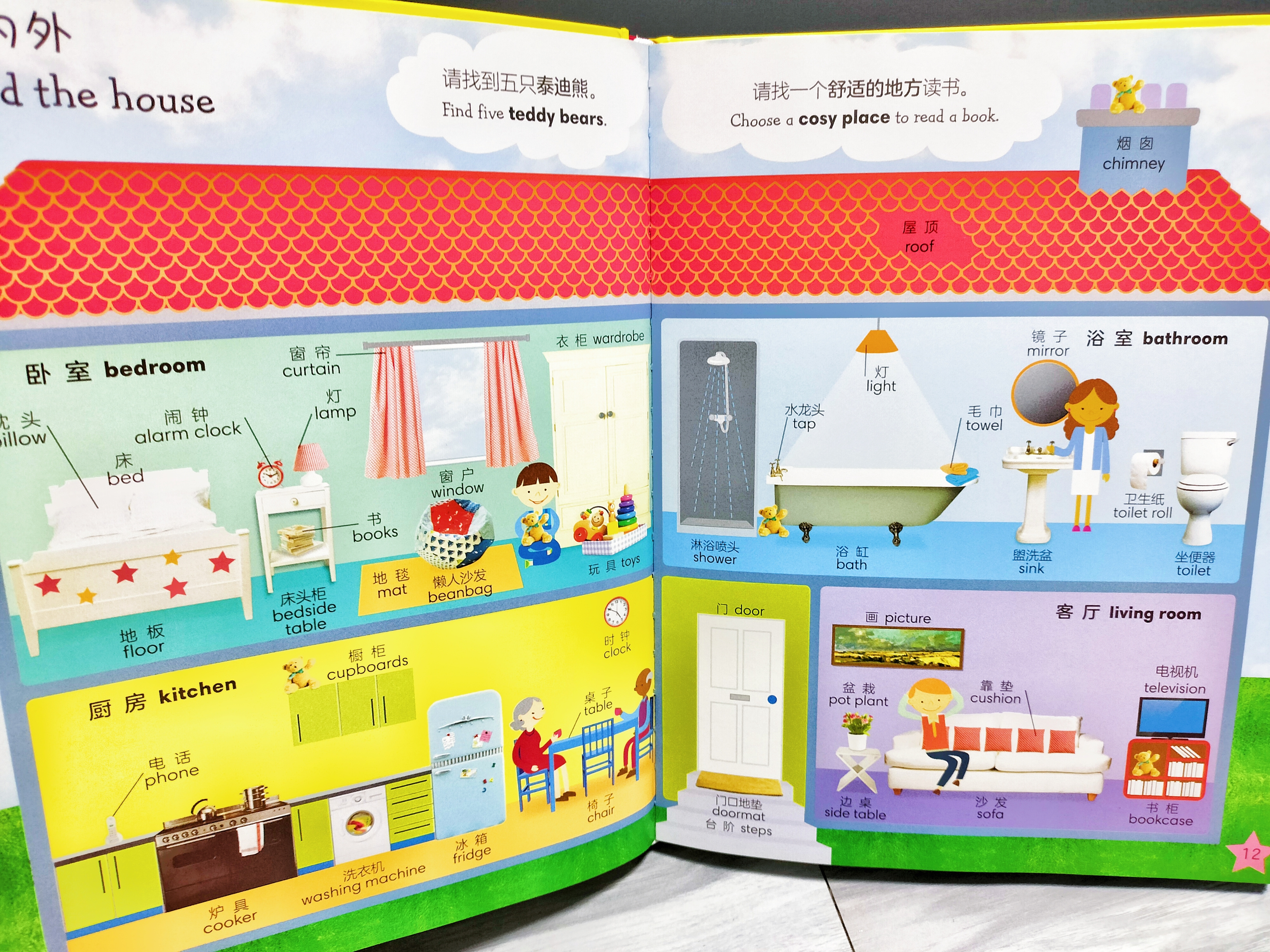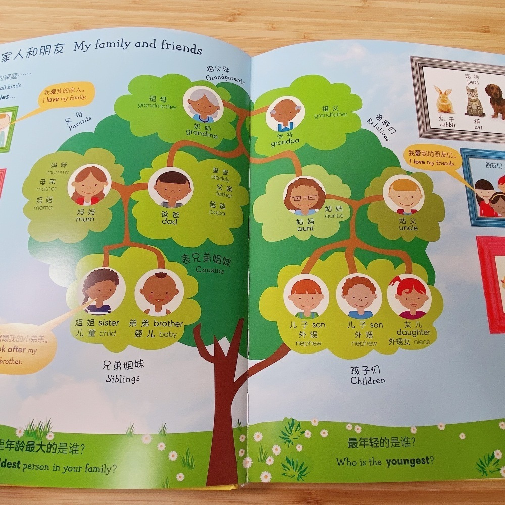 铜版纸的沙沙声里藏着设计的巧思:百科蓝皮书里藏着登月火箭的零件名称,儿童黄本中埋伏着五只泰迪熊等待探索。这哪里是词典?分明是纸上的环球影院和寻宝地图。当孩子指着“aunt”和“nephew”在家谱树上穿行,或在食物分类表里发现番茄竟是水果时,语言便从符号变成了探险的罗盘。难怪欧洲妈妈们痴迷DK——它把单词教成了童话,又把常识写成了诗。若把“How many green leaves?”换成中文,大约就是陶渊明“采菊东篱下”的悠然,中西启蒙的意趣在此刻悄然相通。