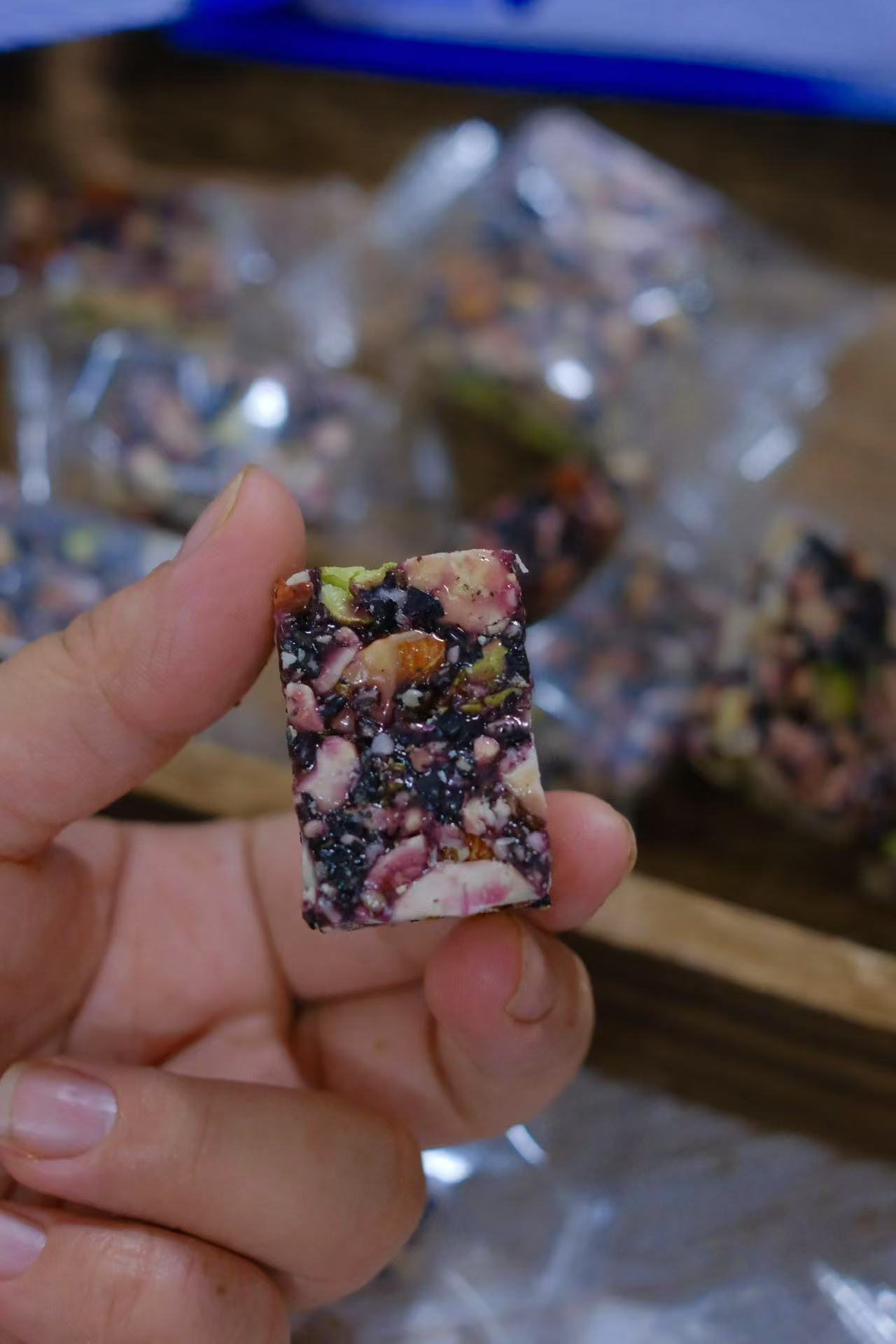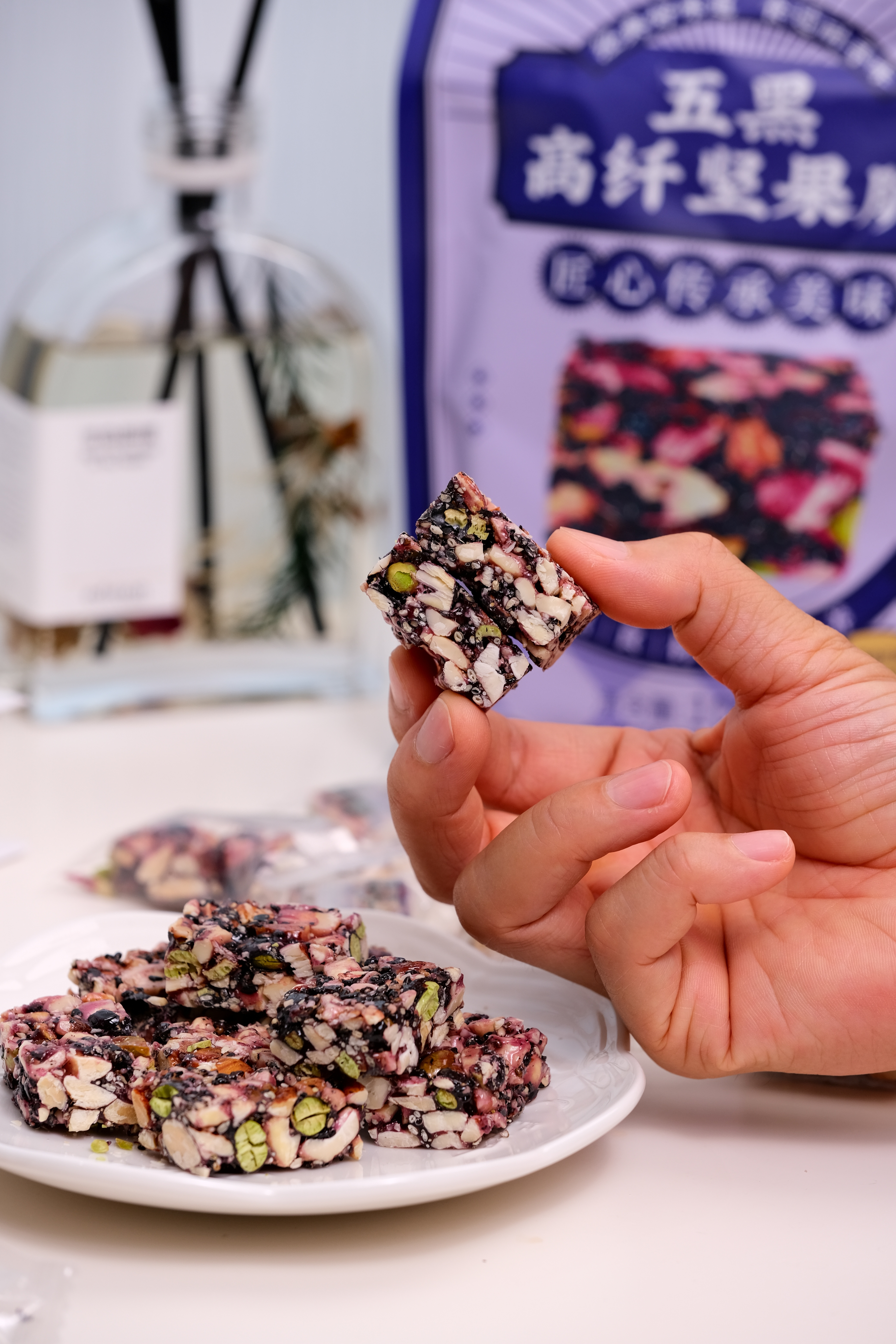老话说“逢黑必补”,老祖宗的智慧藏在草木之间。黑芝麻是《本草纲目》里“补五内、益气力”的仙家粮,黑枸杞在西北荒漠中凝练出花青素的紫霞,黑桑葚曾是慈禧梳妆台上乌发的秘方——如今这些带着岁月灵气的黑色食材,与扁桃仁、腰果在高温烘焙中相遇,脆响间迸发出香浓与清甜。咬下的那一刻,仿佛能尝到张仲景药柜里的草木香,却化作指尖一块轻盈的酥脆。