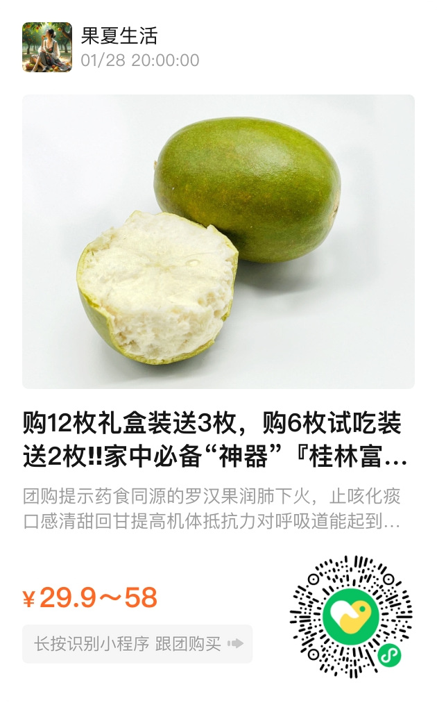 总结:『桂林富硒无籽罗汉果』以天然富硒、无籽清甜的特点,成为润肺降火的养生佳品。活动期间赠礼加倍,为健康加码,为生活添一份润泽。