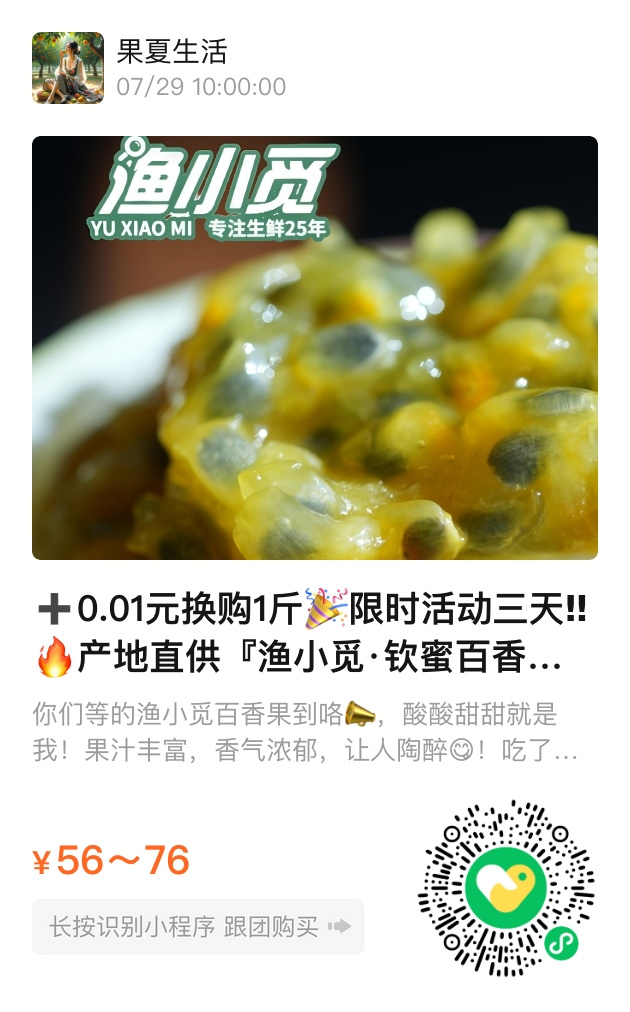 【总结】从枝头甜度到舌尖惊喜,渔小觅钦蜜百香果用9:1的黄金酸甜比诠释了夏日风味。现摘现发的头茬鲜果,正载着花果香与维C能量奔赴餐桌,让每个打开的瞬间都成为热带风情的即兴演出。