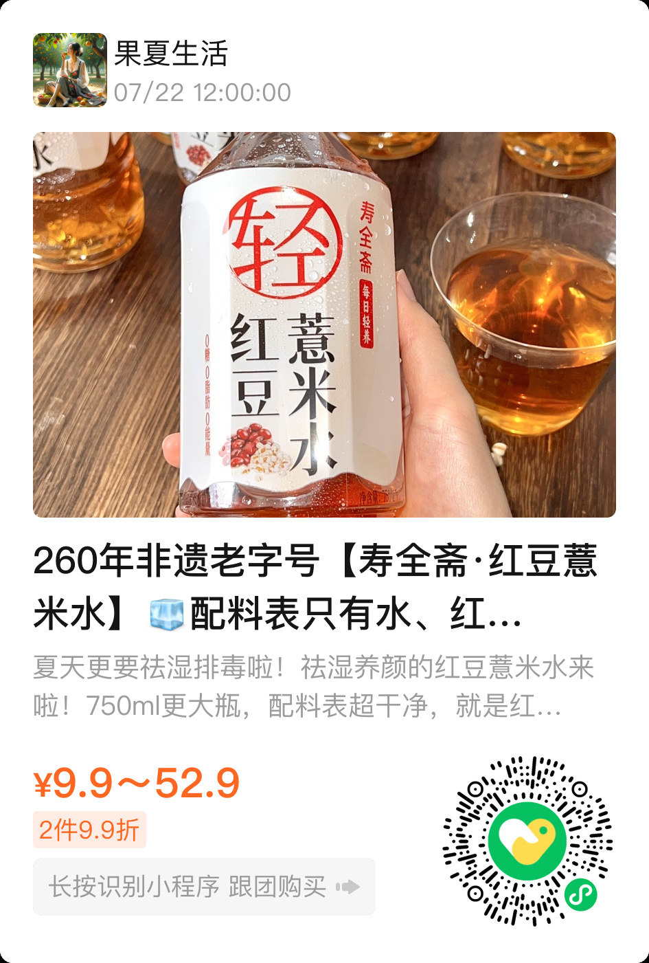 总结:寿全斋红豆薏米水以干净配料和非遗工艺,为夏日祛湿带来天然解决方案。活动期间多重优惠助力养生计划,简单一瓶,滋养身心。