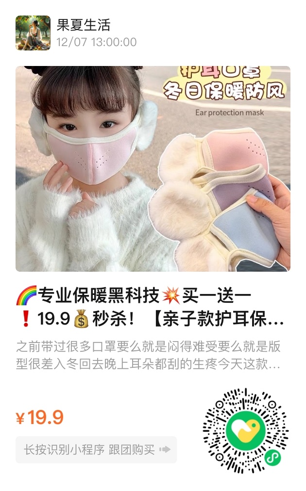 这个冬天,买一送一的19.9元藏着两份暖意:成人款的浅灰像远山雾霭,儿童款的粉白似枝头新雪。不必等”晚来天欲雪”才备上围炉,通勤路上、校门口的风里,口罩与耳罩的拥抱早已候场。