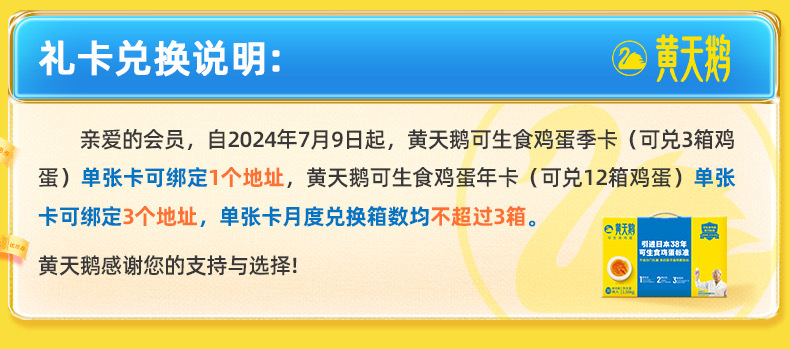 活动内容:购买黄天鹅季卡或年卡即赠对应好礼(赠品于签收后7个工作日内发出),多档选择满足不同家庭需求。用黄天鹅鸡蛋承包一年的营养,让健康和美味从此简单。