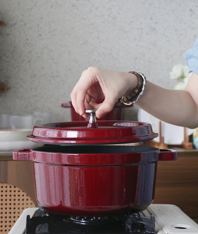 珐琅锅的好,藏在细节的褶皱里。锅盖内侧的“集水钉”设计,让蒸汽化作温柔的雨滴落回食物,像极了一位深谙火候的祖母,总能用最少的水煨出最浓的滋味。小皱菊贴花用700℃高温烙进釉面,不像印花会褪色,倒像极了那些经得起时间考验的感情。而三层比利时釉料的加持,让粘锅的烦恼变成偶尔的情趣——毕竟连米其林主厨都说:“粘锅的肉才有灵魂。”