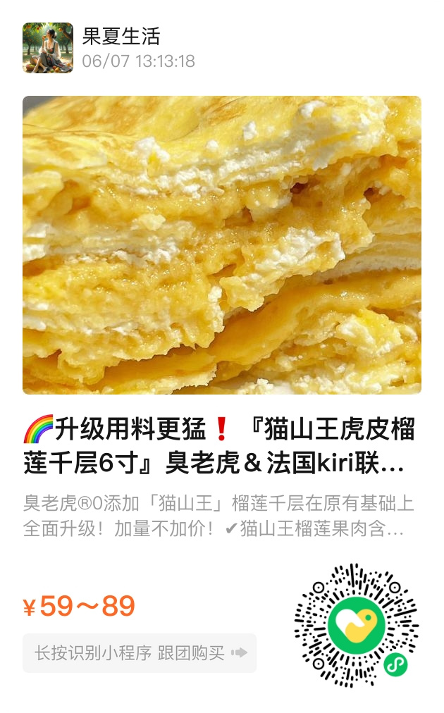 活动:即日起至9月9日,购猫山王榴莲千层三盒装赠榴莲斑斓冰粽一枚。