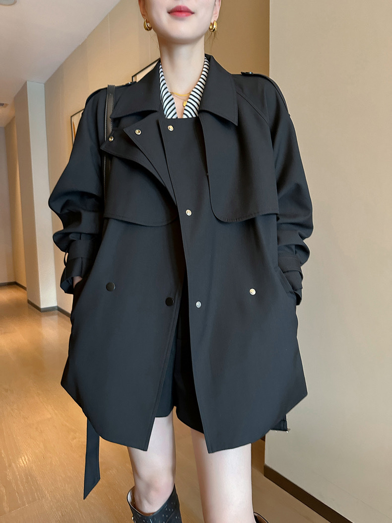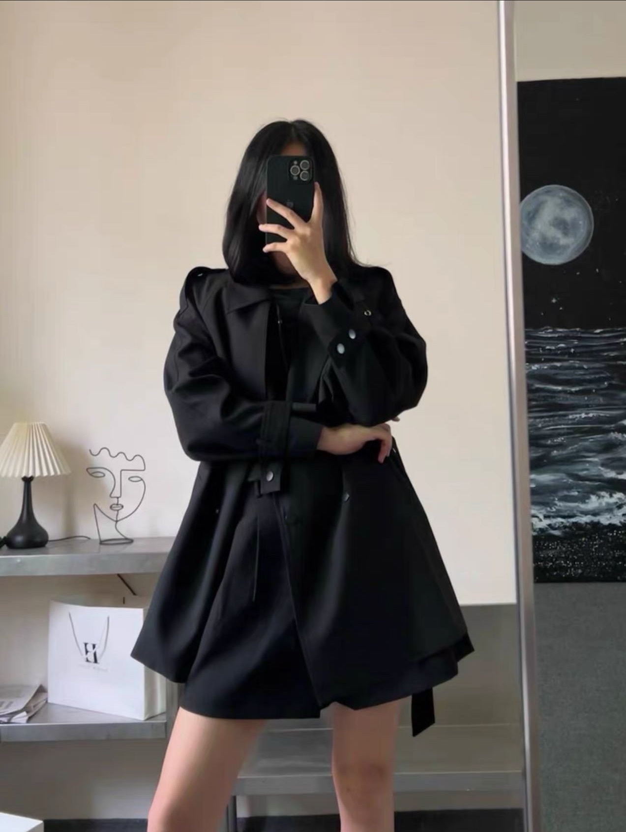 风衣的灵魂在于“经得起时间打量”。客供梭织面料挺括却不板硬,走线工整得像一首押韵的十四行诗——毕竟,真正的英伦风骨从不在细节上妥协。腰带一系,是赫本式的俏丽;敞怀穿着,又有了《晚秋》里汤唯的慵懒。小个子姑娘别怕,中长款的长度是精心计算过的黄金比例,刚好让身高显得像被拉长的五线谱,每一步都踏在显瘦的节拍上。
