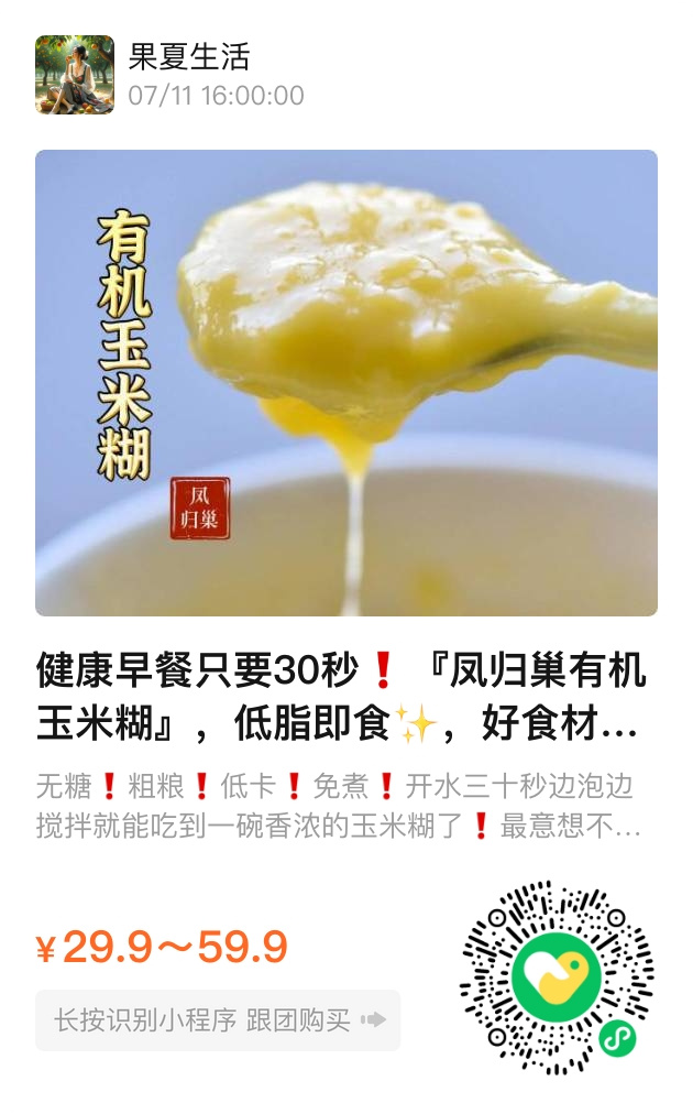 现活动期间,三袋玉米糊赠450g玉米糁,59.9元就能把四百个有机种植的清晨带回家。这个在工业化洪流里逆流而上的品牌,用野鸡复归的故事告诉我们:真正的健康,不过是让食物回到它原本的样子。