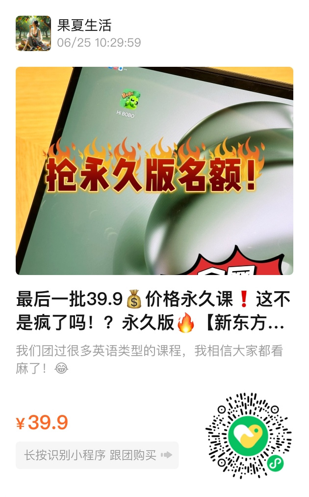 总结:新东方BoBo英语系统课以超高性价比提供520节永久课程,搭配海量赠课资源,帮助孩子快乐学英语。限时秒杀价39.9元,手慢无!
