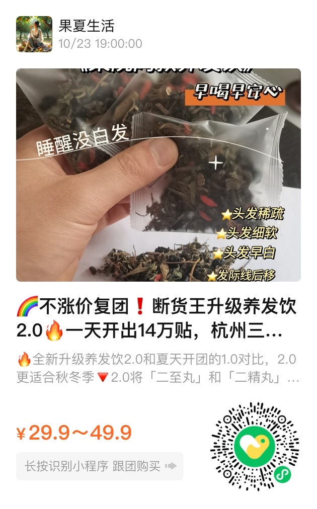 深秋的梧桐叶飘落时,总让人想起《本草纲目》里那句“发为血之余”。古人早知头发的秘密——它不是无根的浮萍,而是身体寄来的“情书”。如今杭州三甲医院的专家们,将墨旱莲、女贞子、黄精、枸杞四位“老友”请进茶包,升级成这款养发饮2.0,仿佛把张仲景的药柜搬进了保温杯。药食同源的智慧,藏在每一包不到5毛的酸甘滋味里,连爱喝奶茶的年轻人也忍不住感叹:“原来《黄帝内经》和拿铁可以兼得。”