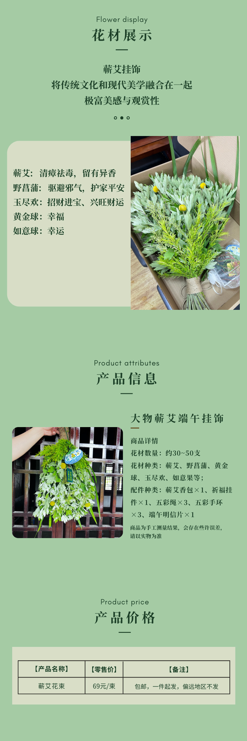 端午的晨露还沾在叶片上,湖北蕲春的艾草已被农人小心翼翼采下。李时珍在《本草纲目》里写:“艾以蕲州者为胜”,这话藏着古人的智慧——蕲艾叶片肥厚,香气如药如茶,比起寻常艾草,更像一位饱读诗书的隐士,清瘴祛毒时还不忘留一缕异香。这束端午挂饰里,野莒蒲是提神醒脑的侠客,黄金球捧着金灿灿的福气,玉尽欢和如意果的名字听着就像从《楚辞》里溜出来的小精灵。老祖宗说“清明插柳,端午插艾”,门楣悬艾时,仿佛能听见两千年前屈原在江畔吟哦:“兰芷变而不芳兮,荃蕙化而为茅。”