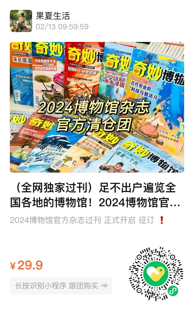 活动说明:29.9元秒杀半年刊合集,现货即刻发货(偏远地区运费另计),页页皆是各大博物馆盖过认证章的文明切片。