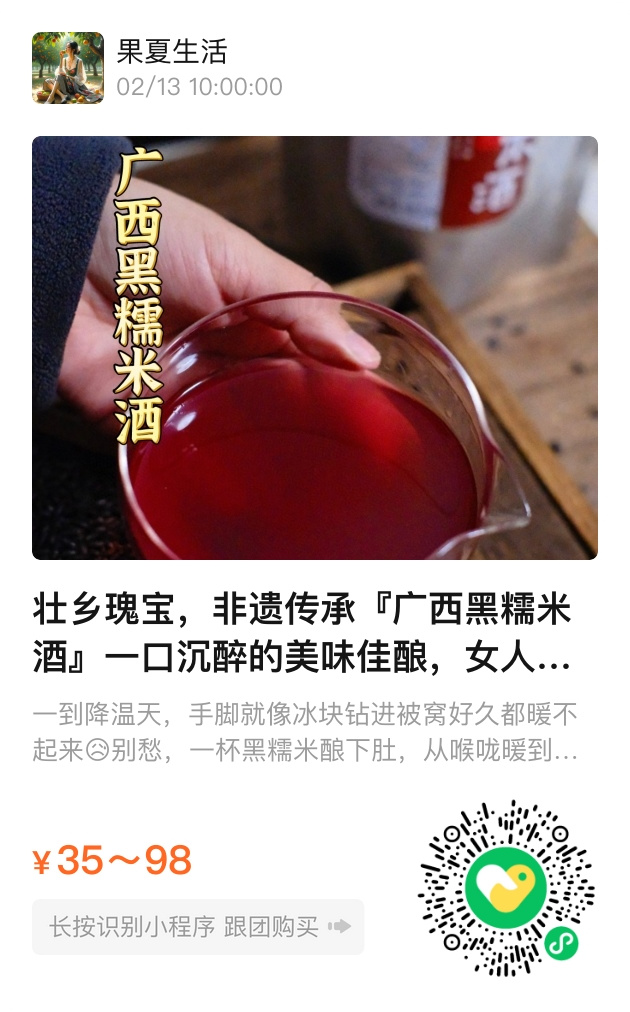 这个丰收节,让黑糯米酒替你封存一份壮乡的秋意。500ml的玲珑装适合初尝,2500ml的家庭装则藏着围炉夜话的默契。冷饮清冽如山泉,热饮醇厚似晚霞,若是学广西人用它煮一碗酒酿蛋,连厨房都能飘出五言绝句的平仄香。