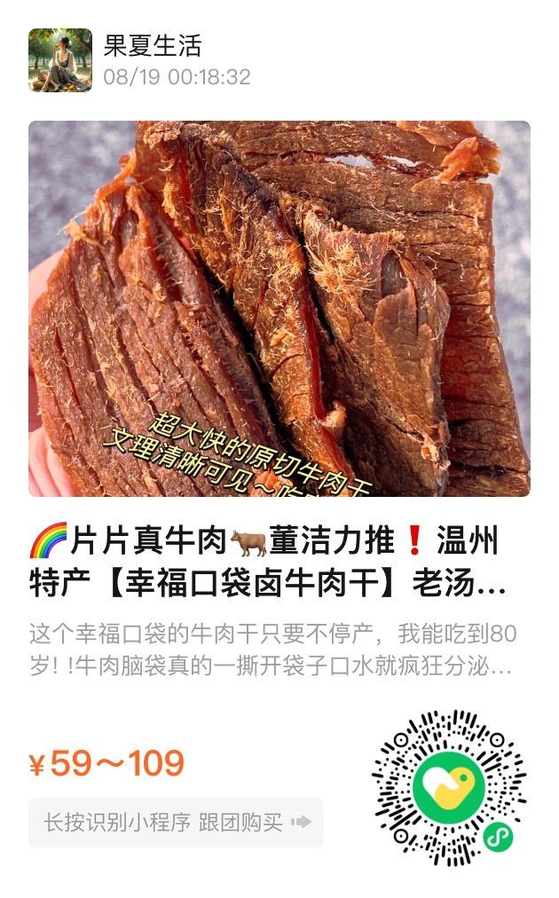 拆开那片巴掌大的独立包装,卤香便像温州巷口的晨雾般漫开。幸福口袋的牛肉干,分明是懂人间烟火的——湿润的肉质藏着老汤沉淀的温柔,牙齿轻轻一压,肉汁便渗出三分江南的甜润、七分黄牛草的清香。董洁推荐的何止是零食?分明是温州老师傅用慢火熬煮的时光秘诀,原切草饲牛肉的纹理里,还晃动着瓯江畔的潮汐。古人说”嚼得菜根,百事可做”,我看这带筋腱的牛肉干,倒是嚼得出生活实实在在的滋味。