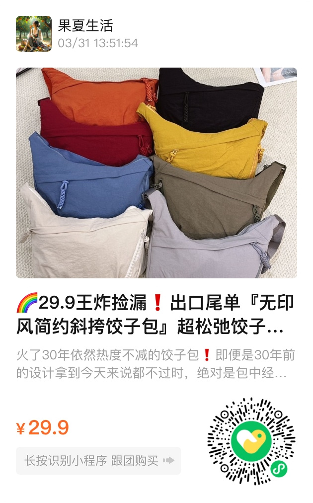 有趣的是,这包总让人联想到《深夜食堂》里那只万能的老汤锅——上班时装得进笔记本电脑,野游时塞得下野餐垫,连夏日必备的小风扇和遮阳伞都能妥帖安置。当代人的包里装着整个江湖,而这只饺子包的江湖格外温柔:它不会在你赶地铁时滑肩抗议,也不会在雨中狼狈地洇湿你的文件。某宝270元的同款身价,此刻29.9元就能交换这份熨帖,倒像是生活突然递给你的一个会心微笑。