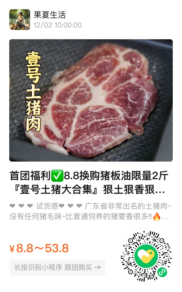 首团福利:8.8元换购限量2斤猪板油。壹号土猪大合集,9款任选3款(不含板油),顺丰包邮到家。