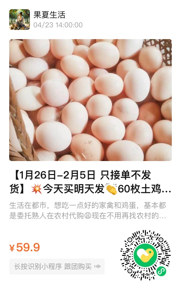 为了感谢每一位支持我们的客户,从1月26日到2月5日,我们推出优惠活动,60枚农家土鸡蛋只需59.9元。如果您怀念那份独特的美味和香气,欢迎走进我们的店铺,体验这来自自然的馈赠。感谢您对我们的信任与支持,愿我们能为您的生活增添一份贴心与健康。