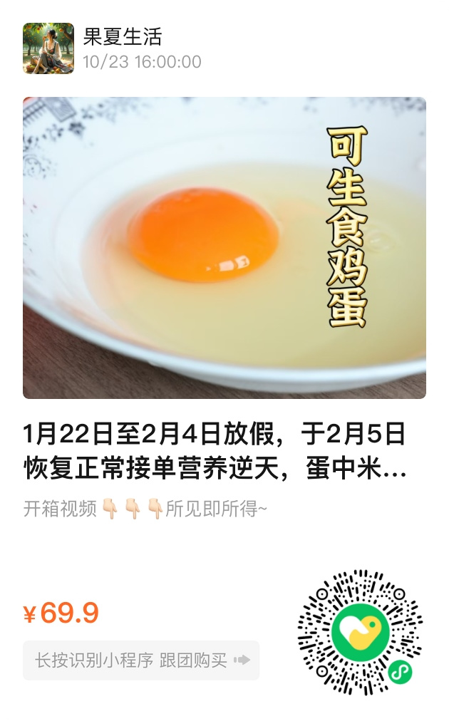 在即将到来的假期期间,我们将于1月22日至2月4日暂停发货,并在2月5日恢复正常接单。期间的每一个订单都是对我们最大的鼓励。感激您对我们的信赖与支持,我们始终在您身边,愿每一颗鸡蛋都能带给您一天的活力。期待能为您的餐桌带来更多美好的体验。