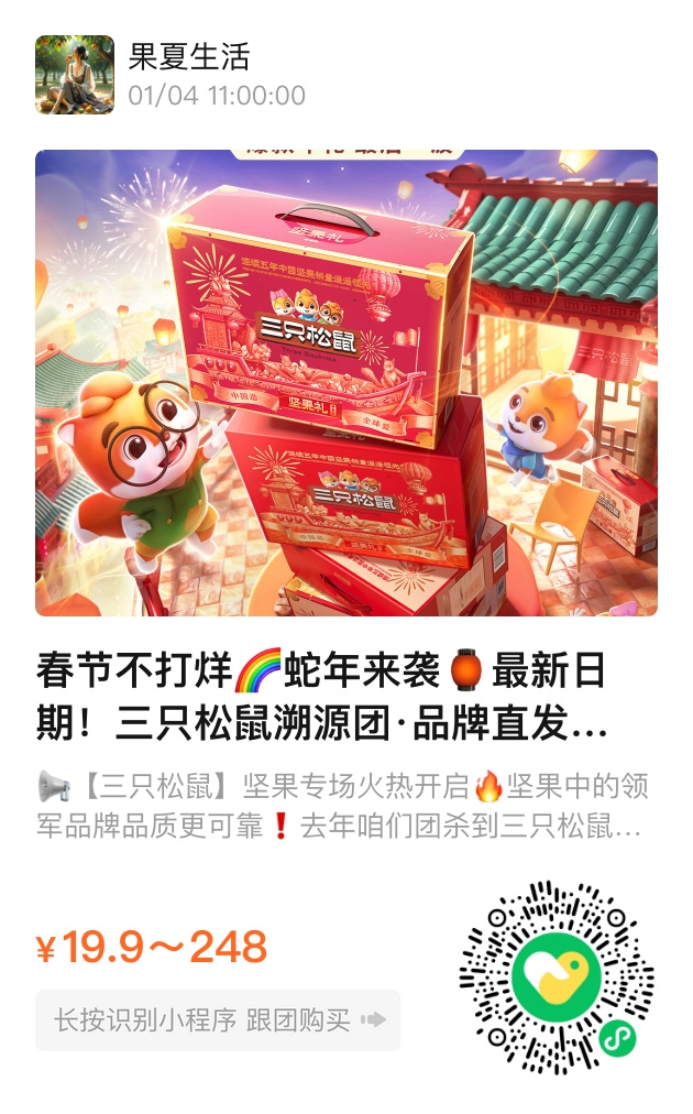 春节来临之际,三只松鼠把众多杰出坚果新品和爆款装入一系列寓意美好的礼盒中:从孔庙联名款到超级爆款祈福款,款款结合传统与现代设计,从内容到外观皆诚意满满。而19.9元的超值优惠更让各类坚果就此飞入寻常百姓家,轻松体会到这些美味带来的浓浓年味。在三只松鼠的故事里,每颗坚果都不仅仅是佐餐小食,更是跨越千年的文化回响。